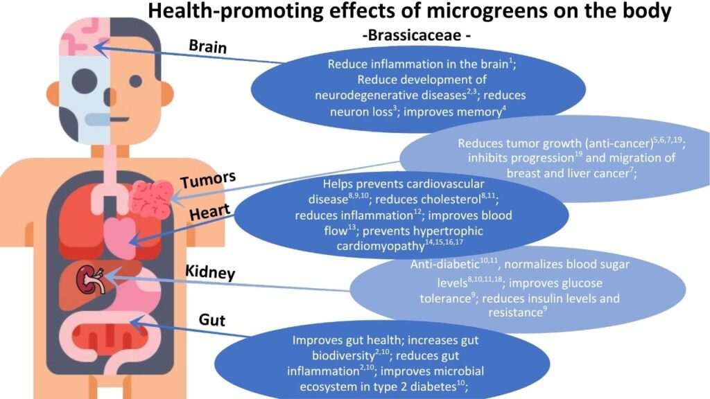 This excellent graphic, done for us by Dr. Andrew Blunck currently at University of DC, depicts what research shows to be the amazing benefits of brassica microgreens. Brassicas include broccoli, kale, cabbage, kohlrabi, mustards, radish, and others. As you can see, they help fight cancer, have amazing anti-inflammatory properties, and are significantly supportive of brain, cardiovascular, kidney, and gut health in general.